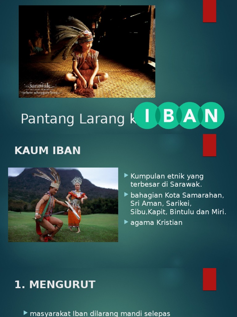 Pantang Larang Kaum Iban Dan Tujuannya : Masyarakat melayu di sarawak merupakan golongan peribumi kedua terbesar selepas kaum iban dan kaya dengan kepercayaan serta amalan turun.