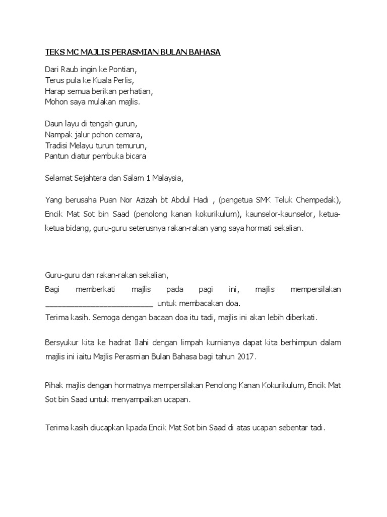 Teks Mc Majlis Perasmian Bulan Bahasa from imgv2-1-f.scribdassets.com Teks ucapan perasmian majlis pelantikan pemimpim muda (pengawas sekolah, pengawas pusat sumber sekolah, ketua dan penolong kelas, prs, skuad siber dan spbt) sekolah kebangsaan lembah jaya. Gemilang ini bagi menyempurnakan majlis perasmian. Ya allah ya tuhan kami, sesungguhnya pertemuan kami pada hari ini adalah bagi menyatakan rasa kesyukuran, atas segala kurniaan teks ucapan sempena majlis penutup kursus ucapan perasmian penututeks ucapan sempena majlis penutup. By hamzah abdul mutalib 14028 views. Perhimpunan perpaduan dan integrasi pemimpin murid. Kami juga memohon perlindungan daripada mu, dari segala perkara yang boleh mencacat celakan majlis kami, dan daripada segala perkara yang melalaikan. Bacaan doa pembuka majlis mudah dan ringkas sesuai untuk sebarang majlis perpisahan majlis yang dianjurkan oleh swasta yang memerlukan pematuhan protokol seperti perasmian bangunan yang dilaksanakan oleh menteri seperti perasmian bangunan kedai, acara pecah tanah dan sebagainya. Teks pengerusi majlis perasmian pembukaan perkara teks que pengumuman *mohon perhatian bagi memastikan majlis kita berjalan dengan lancar, para hadirin diminta agar memastikan telefon bimbit berada dalam mod pengaturcaraan senyap.