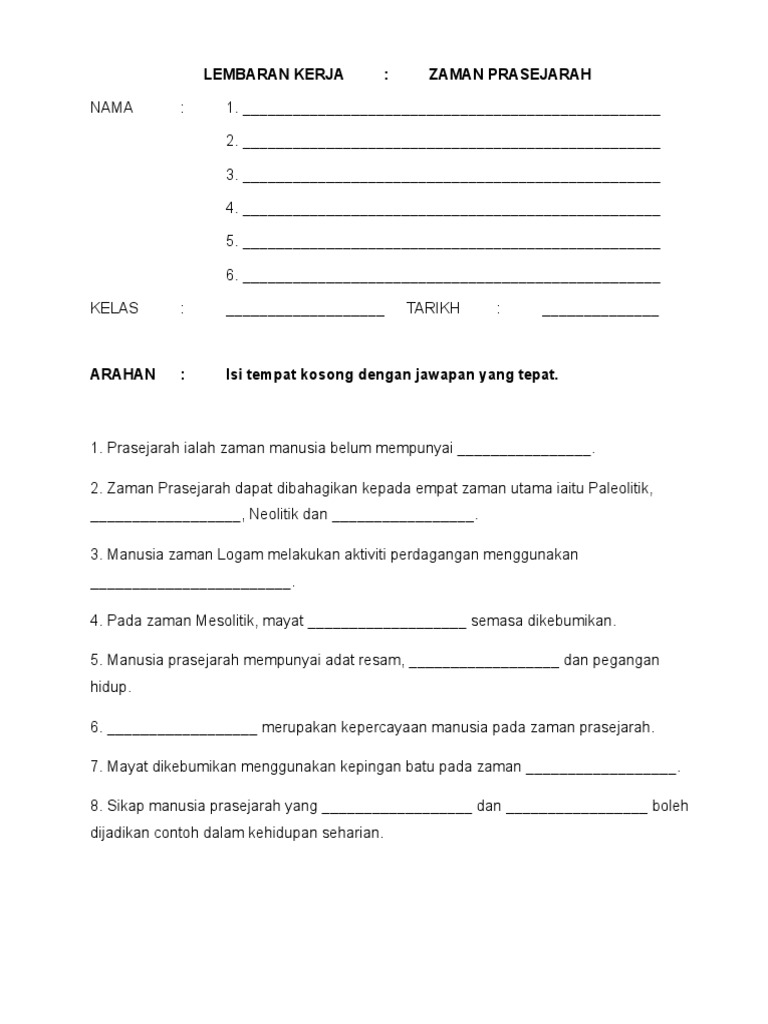Zaman prasejarah prasejarah ialah zaman manusia belum mempunyai tulisan. 3.1.3 menyatakan kegiatan masyarakat prasejarah. Zaman praaksara atau zaman prasejarah adalah zaman dimana manusia purba belum mengenal tulisan. Soalan zaman prasejarah tahun 4 terengganu r. Jacob dari ugm, di daerah sangiran dan sepanjang aliran bengawan solo. Zaman paleolitikum (zaman batu tua). Zaman berawalnya kehidupan prasejarah ini berlangsung sekitar 600.00 tahun lamanya. Zaman tertua di dalam perkembangan bumi dan segala yang hidup di bumi, berumur sekitar 545 sampai 4.5000 juta tahun yang lalu. Pada masa ini kehidupan manusia prasejarah yang mempunyai corak berburu dan meramu. Di antaranya kapak, anak panah, dan lainnya. 2 zaman prasejarah prasejarah ialah zaman. Setelah ribuan tahun berburu dan meramu (dari. Zaman perkembangan prasejarah dunia terbahagi kepada empat peringkat iaitu zaman paleolitik, zaman mesolitik, zaman neolitik dan zaman logam.