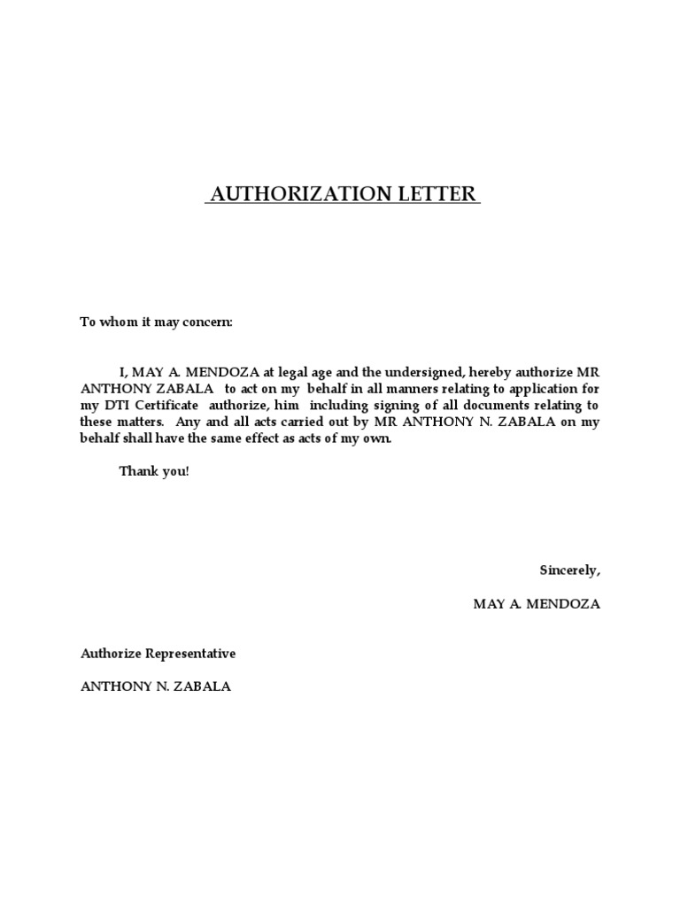 Legally, a letter of authority is sufficient to delegate sensitive legal isp providers are required to send a letter of authorization to an organization for access to install a circuit to a demarc/netpop. An authorization letter is a written proof of permission, in a letter format, that the recipient is liable to perform the listed actions they are authorized to a letter of authorization transfers the authoritative role from the sender to the receiver, with permission. Authorization letter sample letter of authorization template. Documents similar to sample authorization letter to tnb. An individual might be extremely busy or there is a possibility of some unforeseen circumstance due to which, he or she would not be able to collect the important documents.